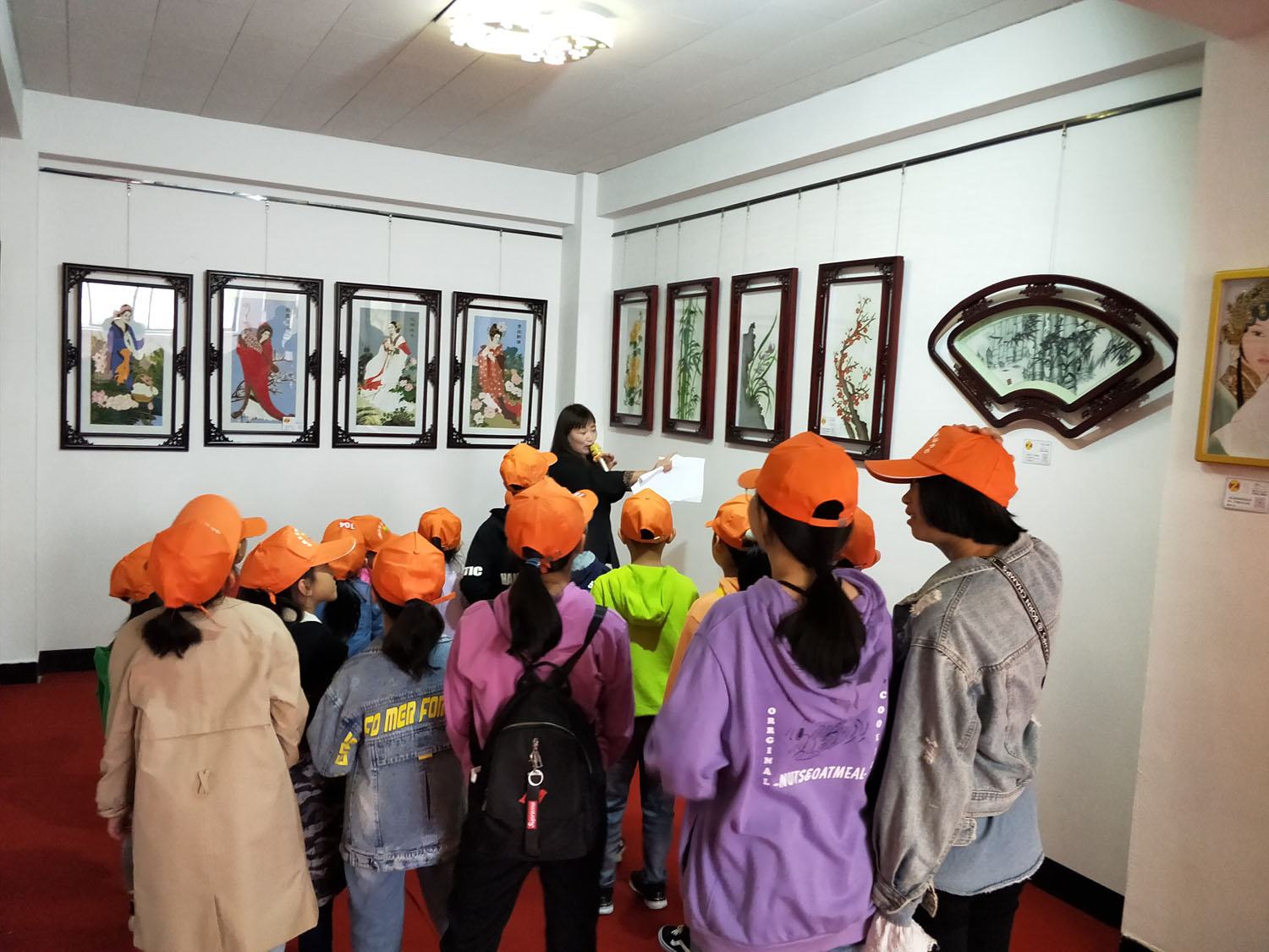 鄭氏砂藝講解員在為研學(xué)小朋友們講解砂畫(huà)作品《梅》、《蘭》、《竹》、《菊》的創(chuàng)作意義