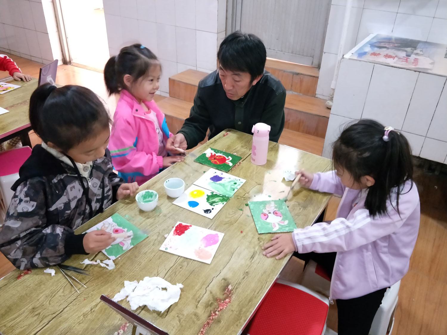 鄭氏砂藝技師為研學(xué)小朋友的砂畫(huà)點(diǎn)籃進(jìn)行指導(dǎo)