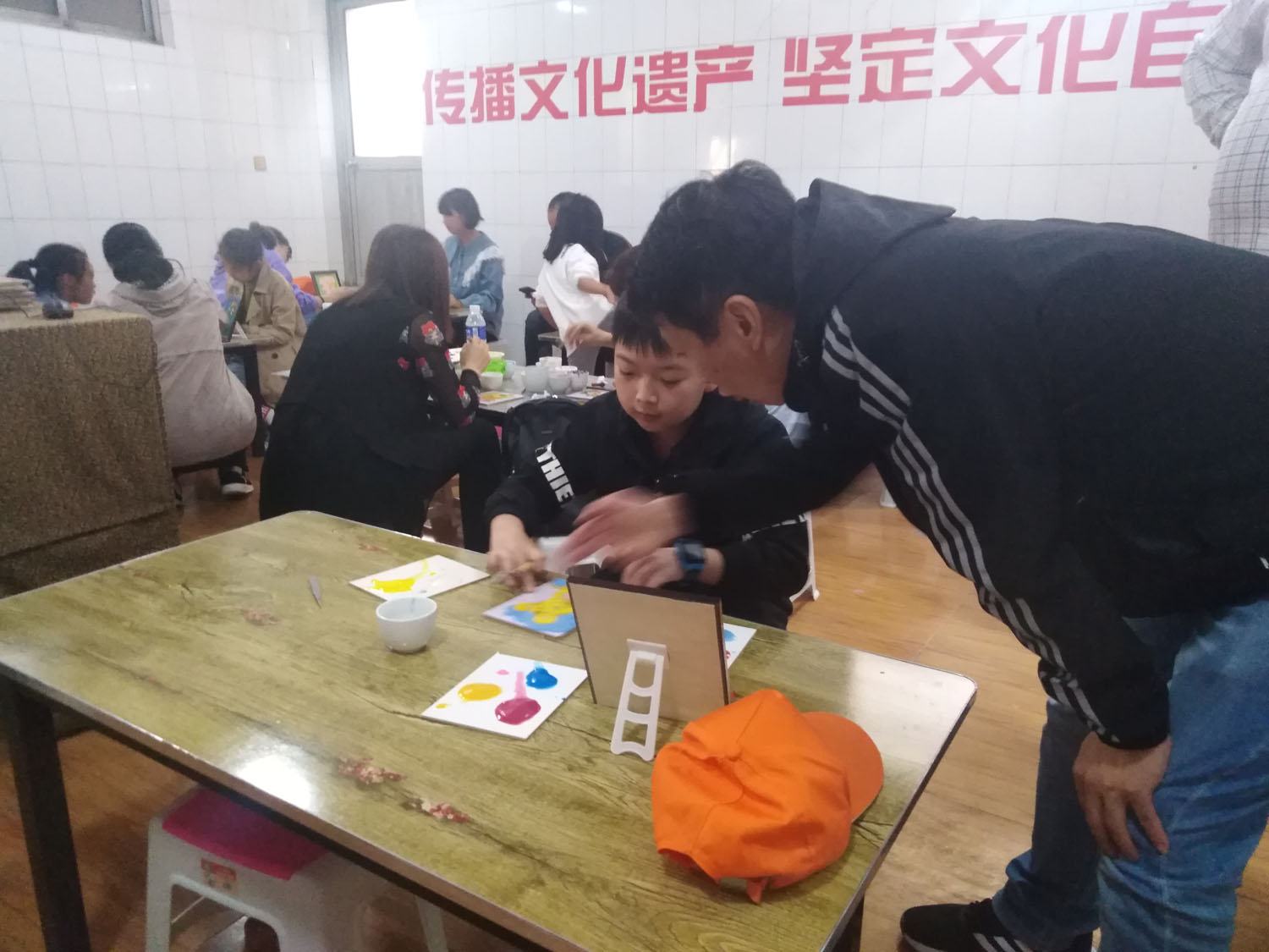 研學(xué)小朋友和家長(zhǎng)正在對(duì)砂畫(huà)點(diǎn)籃的顏色搭配進(jìn)行探討