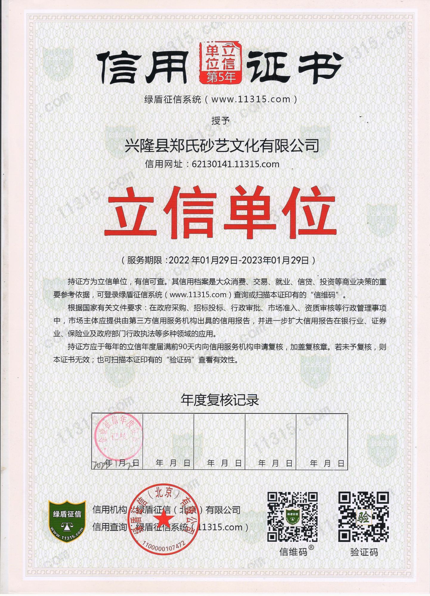 2022年,根據(jù)綠盾企業(yè)征信系統(tǒng)(www.11315.com)采集、整理、保存、加工的信息,經(jīng)綜合信用評價(jià)模型自動評估,興隆縣鄭氏砂藝文化有限公司被評為AAA級信用企業(yè),并授予綠盾征信“信用證書”,企業(yè)已連續(xù)五年獲此殊榮。