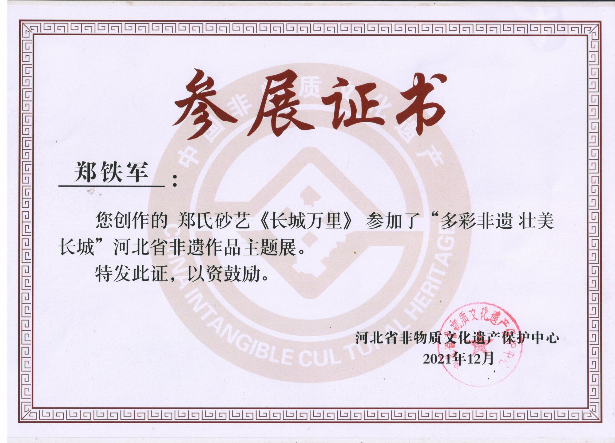 近期,鄭氏砂藝多次應(yīng)邀參加了省、市相關(guān)單位舉辦的各項(xiàng)展出活動,參展的非遺砂畫作品和研發(fā)的旅游商品得到了社會各界人士的一致好評,被活動組委會給予了很大的肯定,在一定程度上提高了我縣和“非遺”文化鄭氏砂藝的知名度。2021年12月,鄭鐵軍董事長的砂畫作品《長城萬里》入選“多彩非遺 壯美長城”河北省非遺作品主題展,并在河北省“非遺”保護(hù)中心展出。2022年1月,鄭氏砂藝砂畫作品《薪火相傳》榮獲“弘揚(yáng)塞罕壩精神文創(chuàng)產(chǎn)品大賽”一等獎。2022年1月,鄭氏砂藝多項(xiàng)作品在承德市旅游協(xié)會舉辦的“傳承非遺手工技藝、助力鄉(xiāng)村振興”活動榮獲獎項(xiàng)。2022年2月,鄭氏砂藝董事長鄭鐵軍在全市開展的“鄉(xiāng)村振興黨旗紅 文藝創(chuàng)新樹先鋒”活動中表現(xiàn)突出,榮獲“承德市2021年度優(yōu)秀鄉(xiāng)村文藝家會員”稱號。