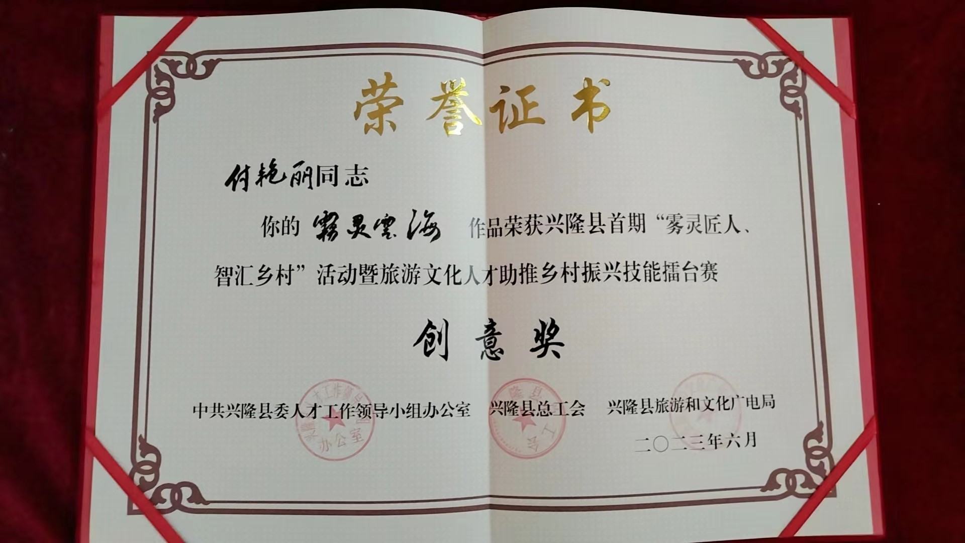 據(jù)了解,此次活動由興隆縣委人才辦、縣總工會、縣旅游和文化廣電聯(lián)合舉辦,興隆縣文化館協(xié)助組織,來自京津冀專業(yè)名家認(rèn)真評審。全縣入圍的60余件書法美術(shù)、攝影、民間工藝美術(shù)、導(dǎo)游解說等四項(xiàng)共評比“霧靈匠人獎”5名,創(chuàng)意獎10名,優(yōu)秀獎9名。歷時兩個月完美落幕。其中鄭氏砂藝砂畫技師付艷麗作品《霧靈云?!穮⒓恿舜舜卧u選,并榮獲民間工藝美術(shù)制作競賽類創(chuàng)意獎。