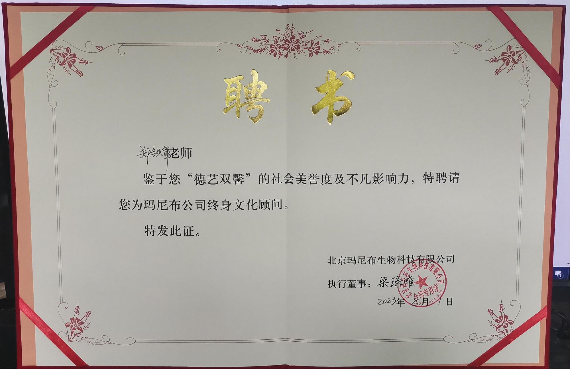 2023年8月1日,鄭鐵軍老師砂畫作品《牡丹》被北京瑪尼布生物科技有限公司永久收藏,同時鄭鐵軍老師被該公司聘為終身文化顧問。