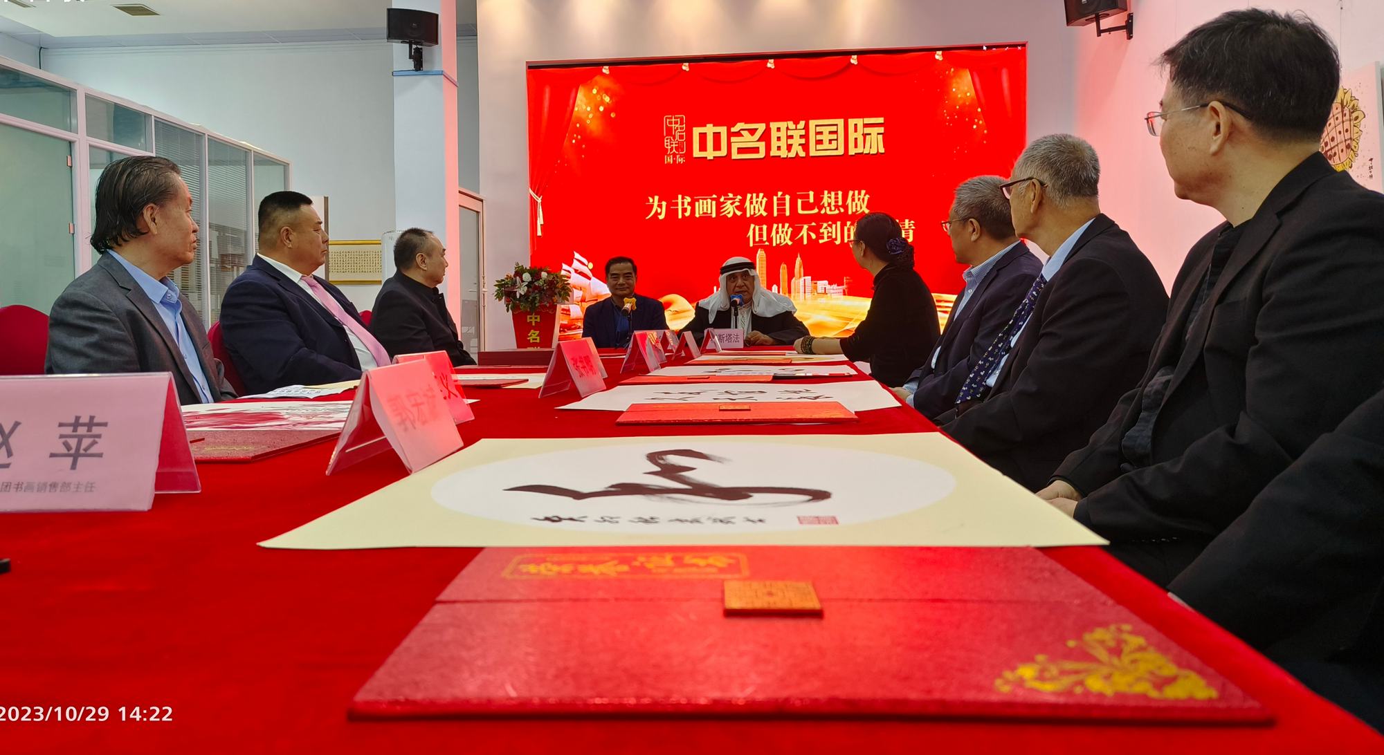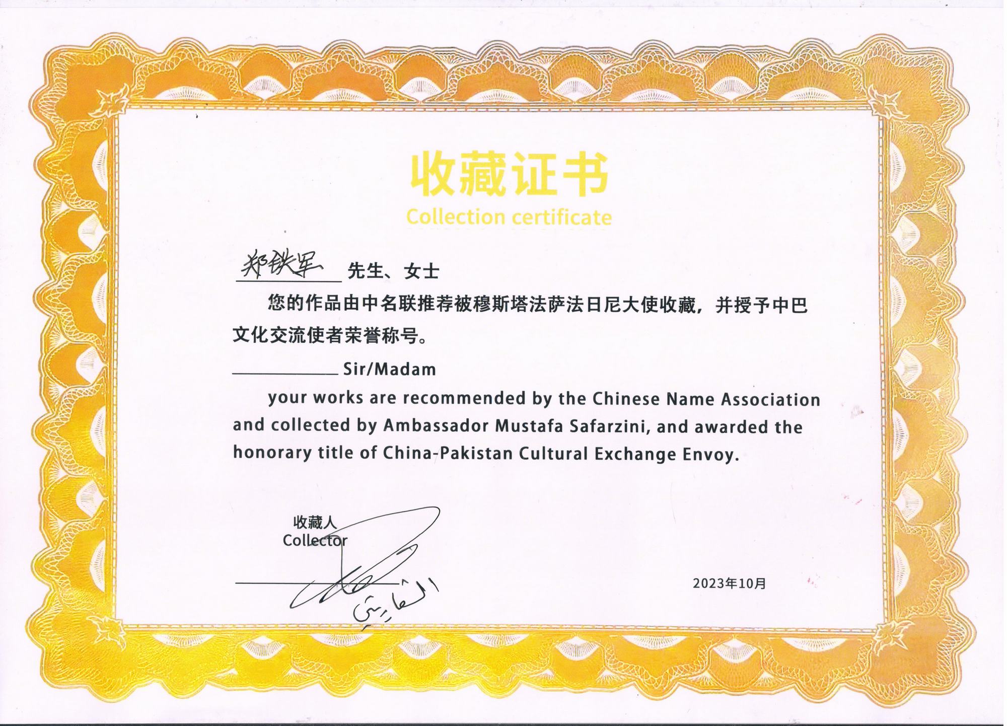 2023年10月29日,應中名聯邀請,并通過中名聯國際平臺,鄭氏砂藝執(zhí)行董事長鄭鐵軍同巴勒斯坦駐華大使穆斯塔法·薩法日尼展開了真摯而又熱情的交流,大使表示十分尊重和熱愛中國的傳統文化,尤其是高度贊賞了鄭氏砂藝(畫)在藝術方面達到的深厚造詣,并將鄭鐵軍砂畫作品《牡丹》選作國禮正式收藏,同時授予鄭鐵軍為中巴文化交流使者榮譽稱號。