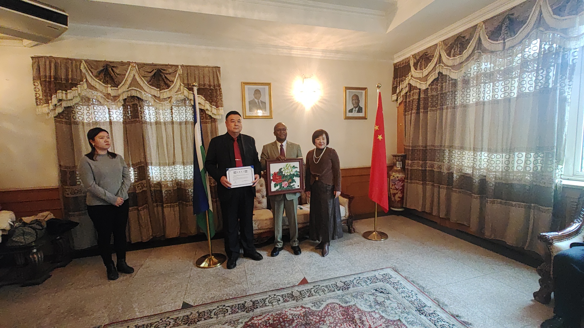 萊索托王國駐華大使邀請中名聯(lián)國際趙萍女士推薦的中名聯(lián)簽約國禮藝術(shù)家鄭鐵軍,于2024年3月26日至27日上午前往萊索托王國駐華大使館進(jìn)行中萊文化交流。萊索托駐華外交官杜麥羅.莫塞邁公使銜參贊對趙萍女士和鄭鐵軍先生的到來表示熱烈歡迎。在萊索托王國駐華使館會客廳中,鄭鐵軍向杜麥羅.莫塞邁介紹了鄭氏砂藝(畫)藝術(shù)特點和文化內(nèi)涵,萊索托王國外交官對鄭鐵軍的作品給予高度評價,對傳統(tǒng)文化藝術(shù)鄭氏砂藝(畫)所蘊含的深厚中華文化底蘊極其贊賞,現(xiàn)場將鄭鐵軍的作品《國色天香》作為國禮永久收藏。杜麥羅.莫塞邁公使銜參贊表示非常榮幸,愿意將更多的鄭氏砂藝(畫)作品贈送全球友華政要,成為中國文化國際傳播橋梁,隨后,親筆簽名收藏證書,并授予鄭鐵軍中非文化交流使者榮譽(yù)稱號。
