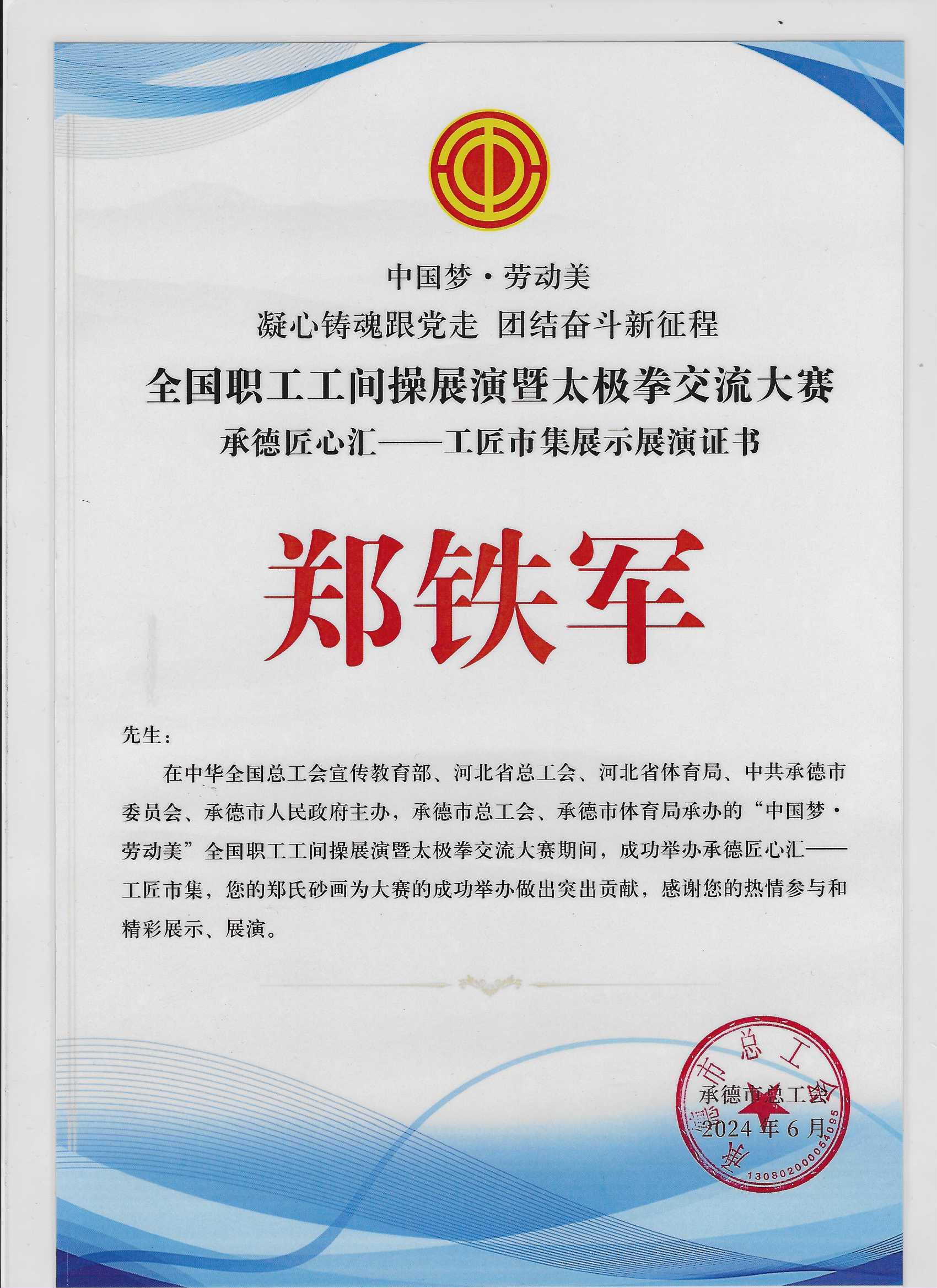2024年6月4日,由全國總工會宣傳教育部、河北省總工會、河北省體育局、承德市委市政府聯(lián)合舉辦的“中國夢·勞動美——凝心鑄魂跟黨走 團結(jié)奮斗新征程”全國職工工間操展演暨太極拳交流大賽活動在承德市奧體中心開幕。本次大賽為期三天,包括工間操展演大賽、太極拳交流大賽、健步走大賽,共有來自各省、自治區(qū)、直轄市,各全國產(chǎn)業(yè)工會、中央和國家機關(guān)工會聯(lián)合會的36支參賽隊600余名職工參賽。