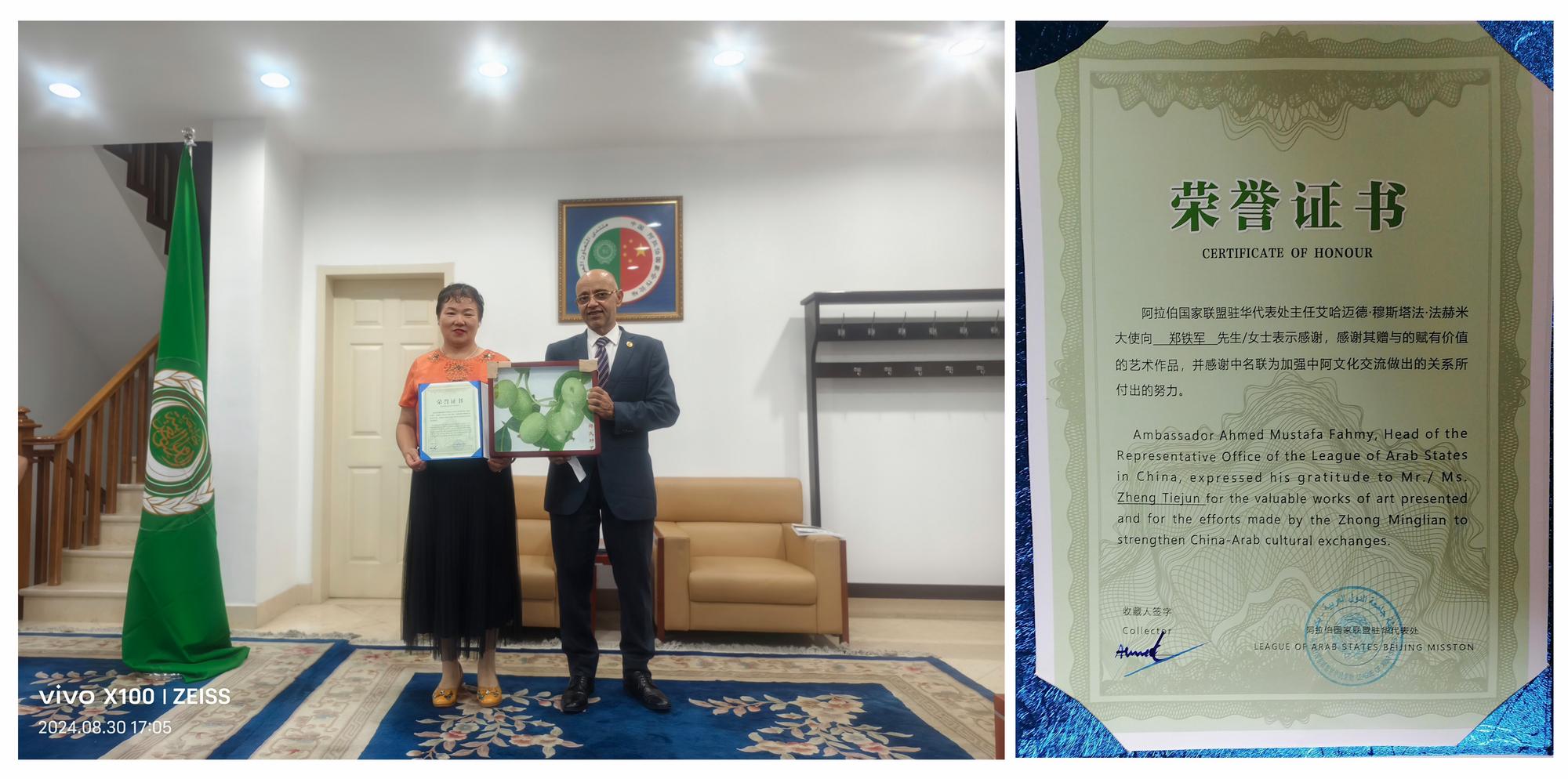 2025年1月16日,應(yīng)阿拉伯國家聯(lián)盟代表處主任艾哈邁德·穆斯塔法·法赫米大使的盛情邀請(qǐng),鄭氏砂藝形象代言人劉秀華攜中名聯(lián)簽約國禮藝術(shù)家鄭鐵軍的精美作品,參加在大使館舉辦的中阿文化交流活動(dòng),并代表興隆文化鄭氏砂藝進(jìn)行了藝術(shù)品捐贈(zèng)與收藏儀式。