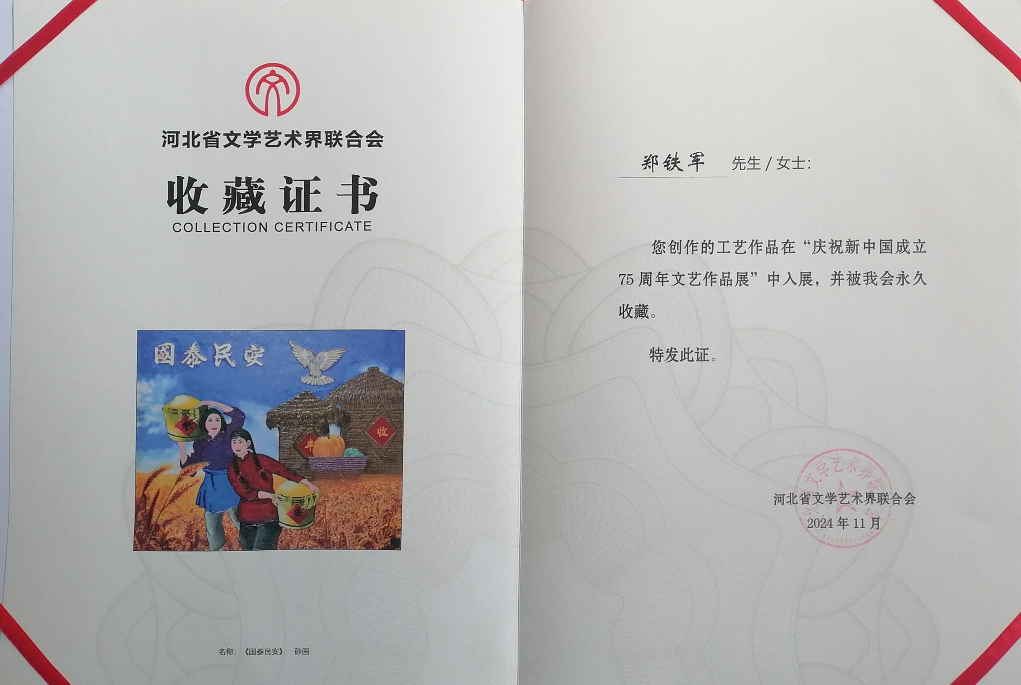 近期,在河北省文學(xué)藝術(shù)界聯(lián)合會(huì)舉辦的“慶祝新中國(guó)成立75周年文藝創(chuàng)作展”中,由鄭鐵軍創(chuàng)作的《國(guó)泰民安》憑借其獨(dú)特的藝術(shù)魅力和深厚的文化底蘊(yùn),被河北省文學(xué)藝術(shù)界聯(lián)合會(huì)永久收藏,成為本次展覽的一大亮點(diǎn)。