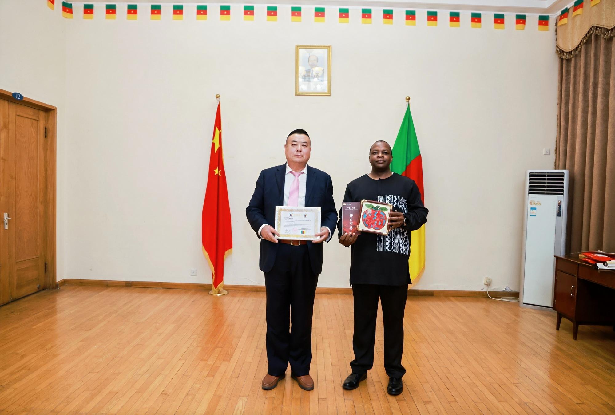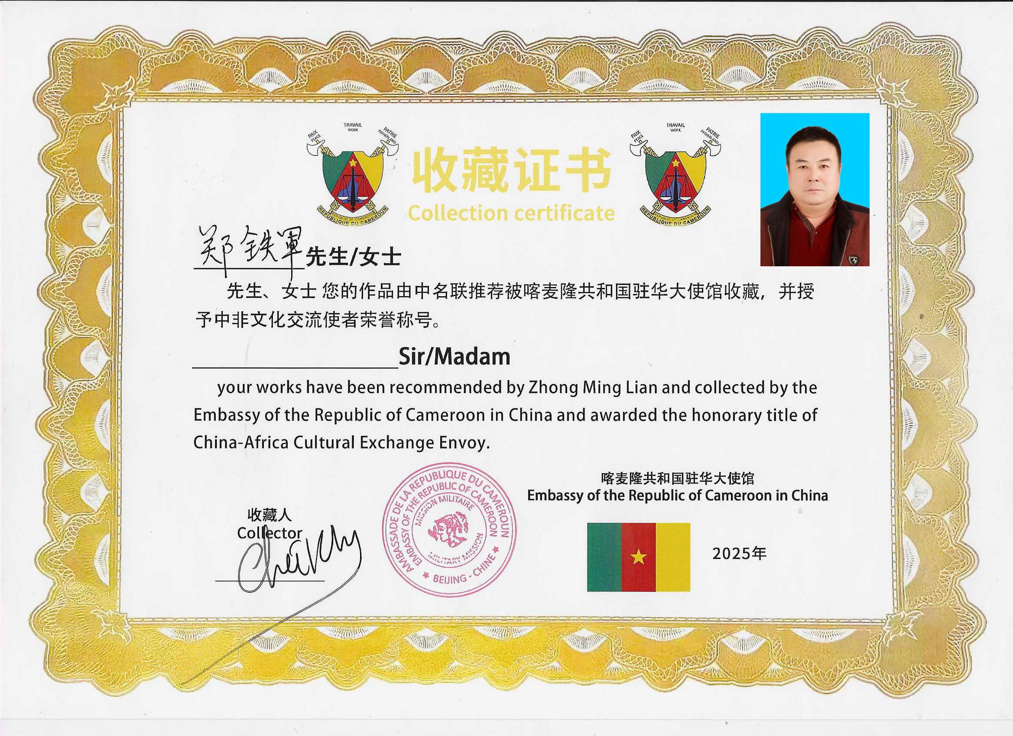 2025年4月26日,中名聯(lián)簽約國(guó)禮藝術(shù)家、非遺傳承人鄭鐵軍應(yīng)邀前往喀麥隆共和國(guó)駐華大使館,參與“一帶一路”中非文化交流活動(dòng)?;顒?dòng)現(xiàn)場(chǎng),其創(chuàng)作的非遺作品《平安福字》被喀麥隆大使館作為國(guó)禮永久收藏,標(biāo)志著河北興隆縣傳統(tǒng)手工藝在國(guó)際舞臺(tái)上的又一次精彩亮相,成為中非文化交流的重要載體??溌●v華使館外交官朱利安·弗雷迪·埃托瓦代表使館,向鄭鐵軍頒發(fā)收藏證書,并授予其“中非文化交流使者”榮譽(yù)稱號(hào) 。