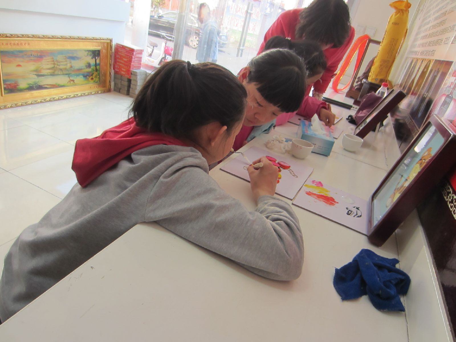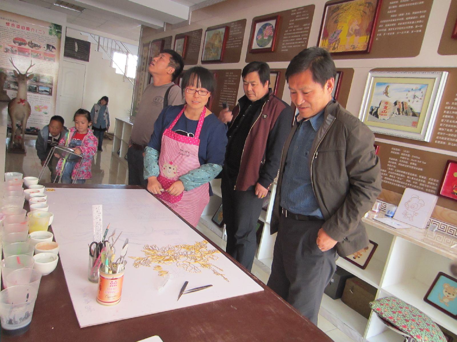 楊書記在體驗(yàn)館和員工交流、看小朋友制作砂畫