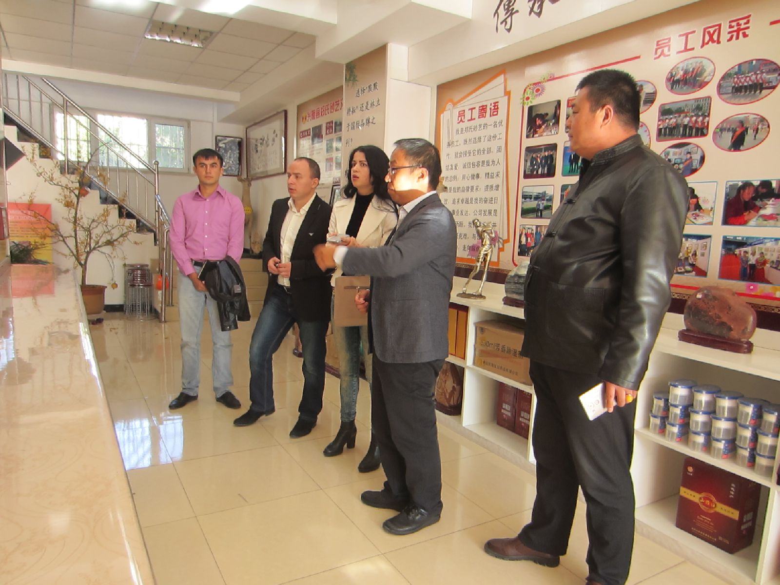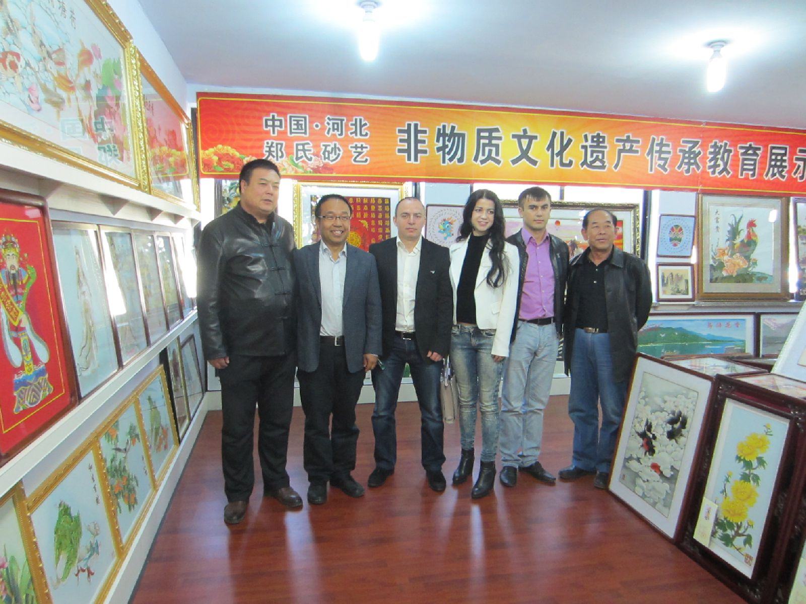 2016年10月17日下午,天津中新天生態(tài)城濱海外國(guó)語(yǔ)大學(xué)董事夢(mèng)祺兼任英語(yǔ)翻譯率領(lǐng)俄羅斯客商勞拉女士(AURA)、鮑家先生(BURTIA)和阿列克謝先生(ALEXANDRIA)來(lái)到興隆縣鄭氏砂藝公司,對(duì)鄭氏金銀絲砂畫(huà)制作車間、傳統(tǒng)工藝、展廳進(jìn)行了商務(wù)性考察。鄭氏金銀絲砂畫(huà)的傳統(tǒng)工藝、精美的做工和豐富多彩的主題畫(huà)面,引起了客商們的極大興趣和關(guān)注。雙方還就產(chǎn)品交易對(duì)接等工作達(dá)成了初步意向。